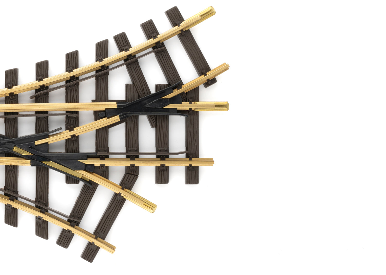 Eine Dreiwegweiche ist die platzsparende Anordnung von zwei Weichen! Gerades Gleis: 375 mm. Abzweigende Gleise: R1, 30°. Zwei elektrische Weichenantriebe (2 x LGB 12010). Die Schaltung kann mit dem LGB Stellpult (LGB 51755) o.ä. erfolgen.