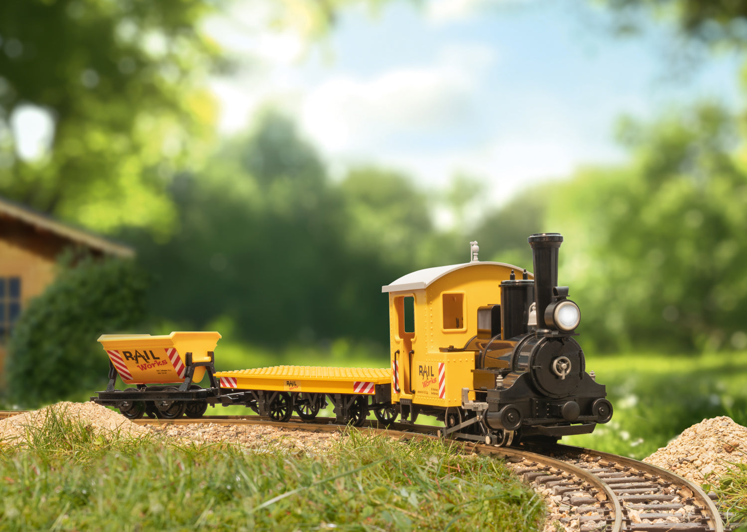 Dieses Startset enthält einen Baustellenzug, bestehend aus einer Tenderlok, einem Klemmbausteinwagen und einem Kipplorenwagen. Die Lok ist mit einem leistungsstarken Motor ausgerüstet und verfügt über ein beleuchtetes Spitzenlicht. Mit den beigelegten Stickern können die Lok und beide Wagen dekoriert werden. Das Set enthält zusätzlich einen kompletten Gleiskreis, Stromversorgung für 230 Volt und einen Fahrregler. Zuglänge ca. 70 cm.
