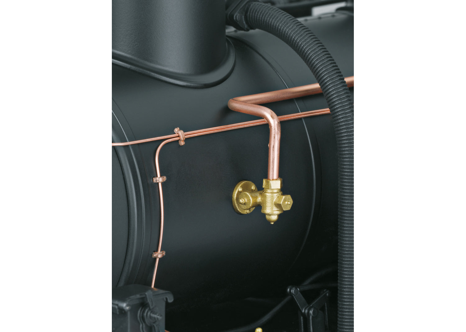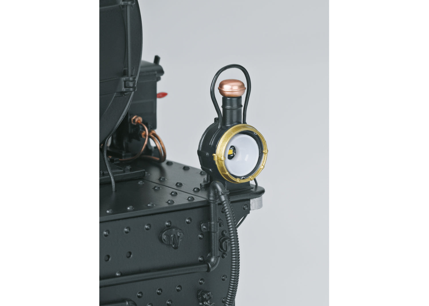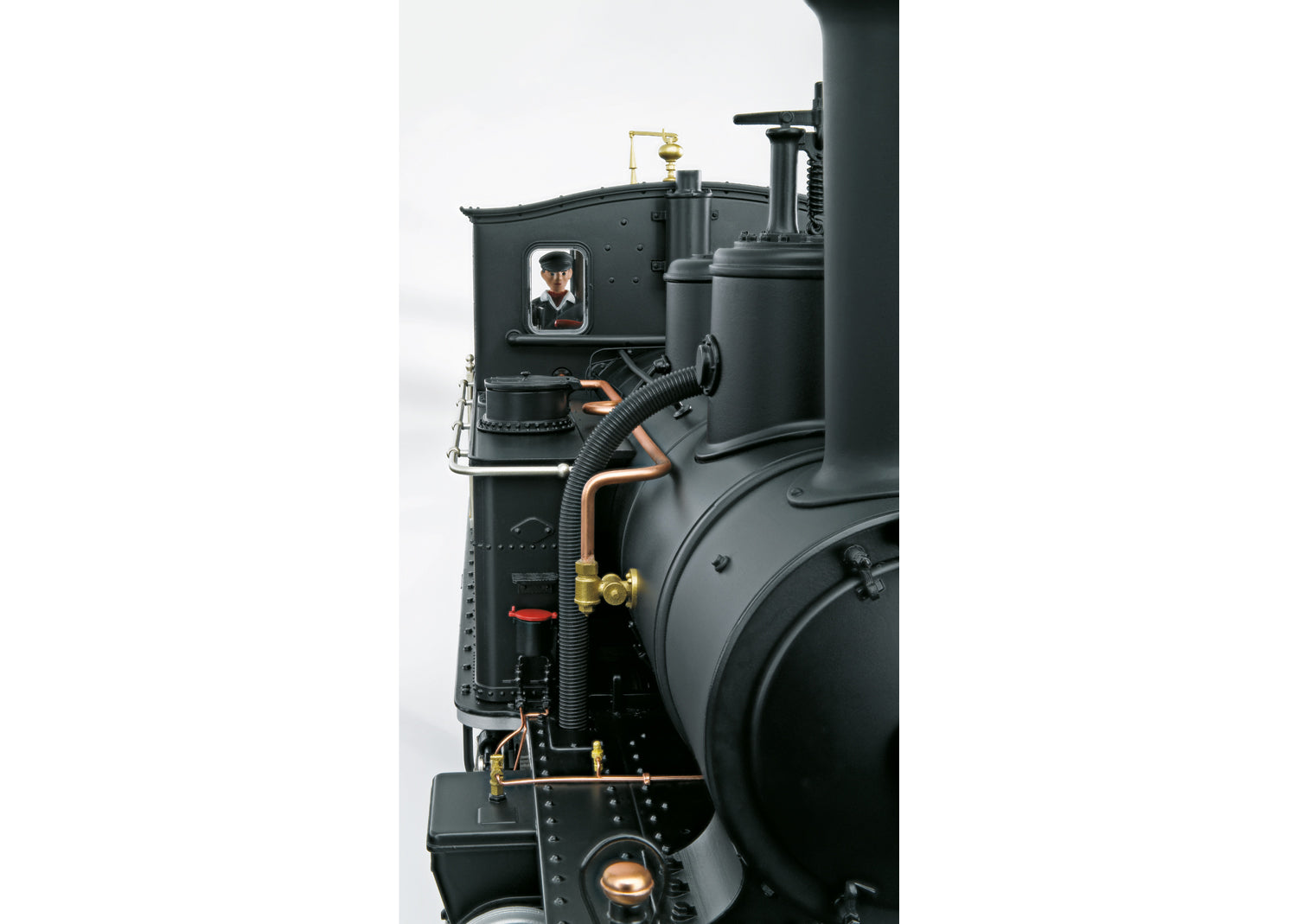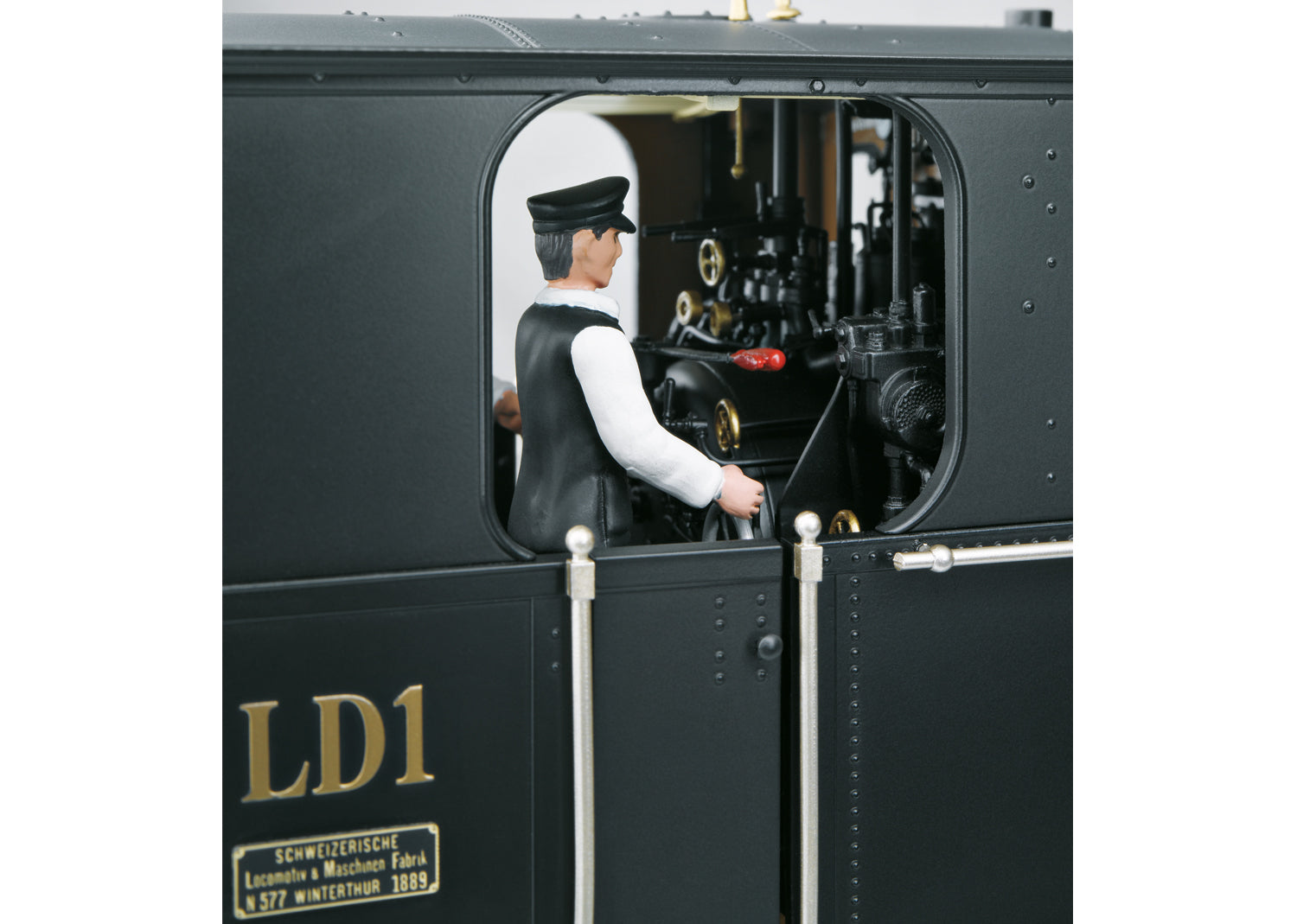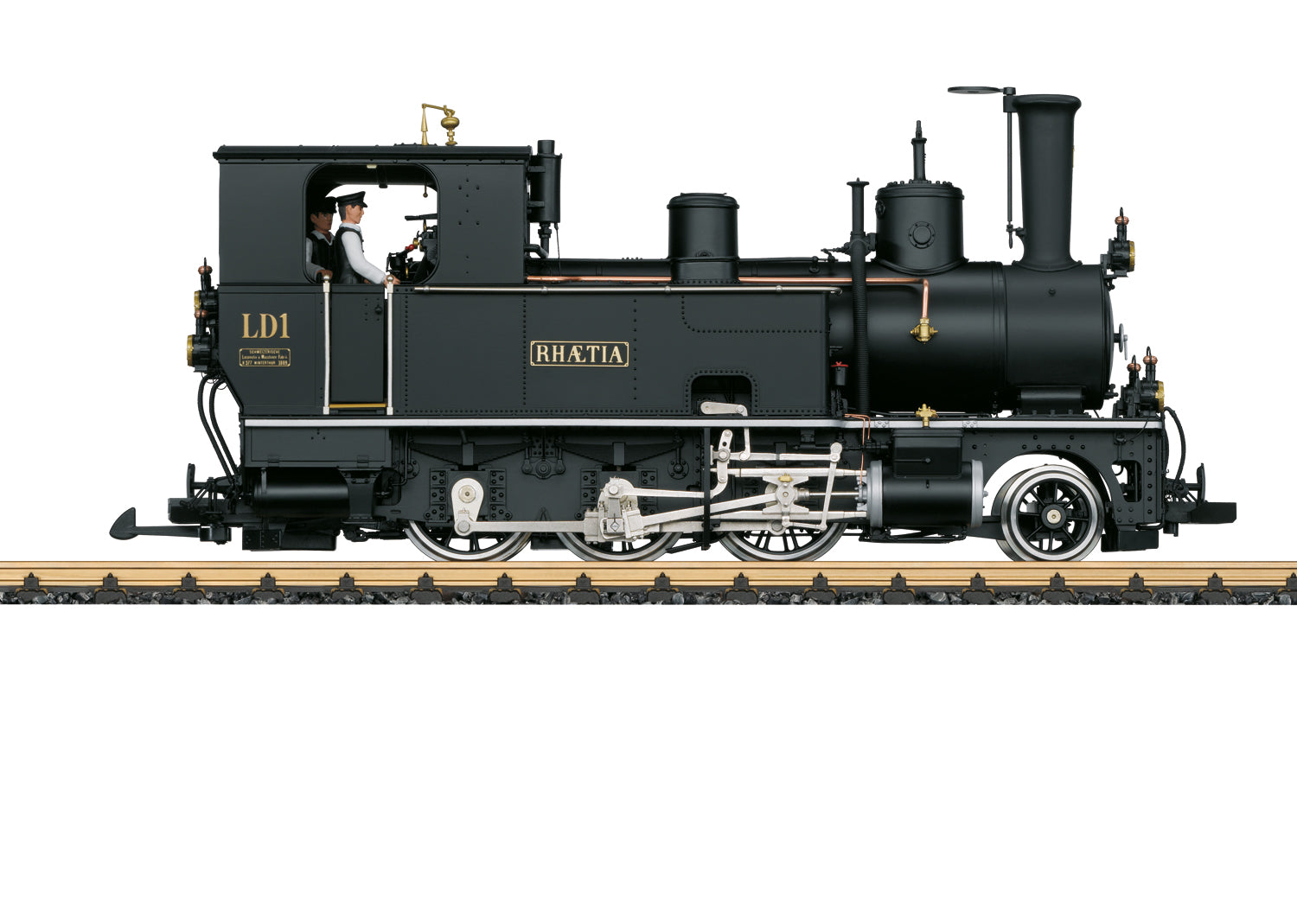 Modell der Dampflok "Rhätia", der ersten Lok der Rhätischen Bahn. Feindetailliertes Modell in schwerer Metallbauweise mit vielen angesetzten Details. Antrieb mit einem Hochleistungsmotor, alle Treibradsätze über Kuppelstangen angetrieben. Türen zum Führerstand und Rauchkammertür zum Öffnen, Führerstand mit kompletter Inneneinrichtung. Originalgetreue schwarze Farbgebung und Beschriftung als "LD 1" der Epoche I, so wie die Lok im Ursprungszustand im Einsatz war und so wie derzeit geplant ist, dass sie nach der Aufarbeitung im Jahre 2024 wieder im Einsatz stehen wird. Ausgerüstet mit einem mfx/DCC-Decoder mit vielen Licht- und Soundfunktionen wie Spitzenlicht, Führerstandsbeleuchtung, Fahrgeräusch, durch Reedschalter auslösbare Pfeife und vieles mehr. Die hintere Kupplung kann im Digitalbetrieb ferngesteuert betätigt werden. Fahrgeräusch auch im Analogbetrieb funktionsfähig. Eingebauter Rauchgenerator mit radsynchronem Dampfausstoß sowie Zylinderdampf, Dampf am Auspuff der Vakuumbremse und Dampfausstoß an der Pfeife, wenn diese betätigt wird.